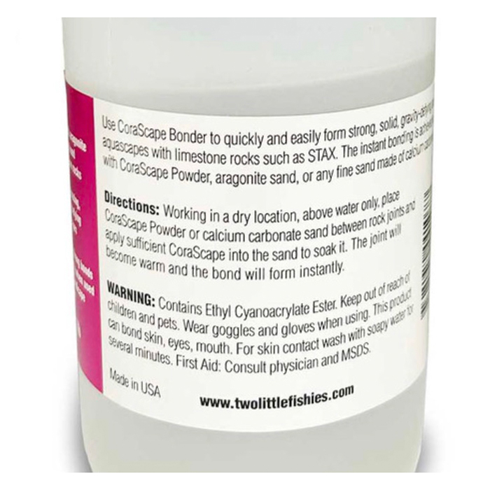 BRIEF DESCRIPTION:  Two Little Fishies CoraScape Bonder and CoraScape Powder are a system for instantly bonding aquascaping rocks. The bonder is a thin Cyanoacrylate and the powder is fine aragonite sand. The bonds formed by this system are very strong.