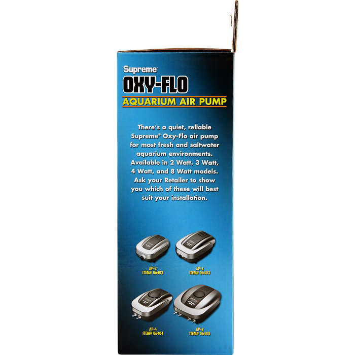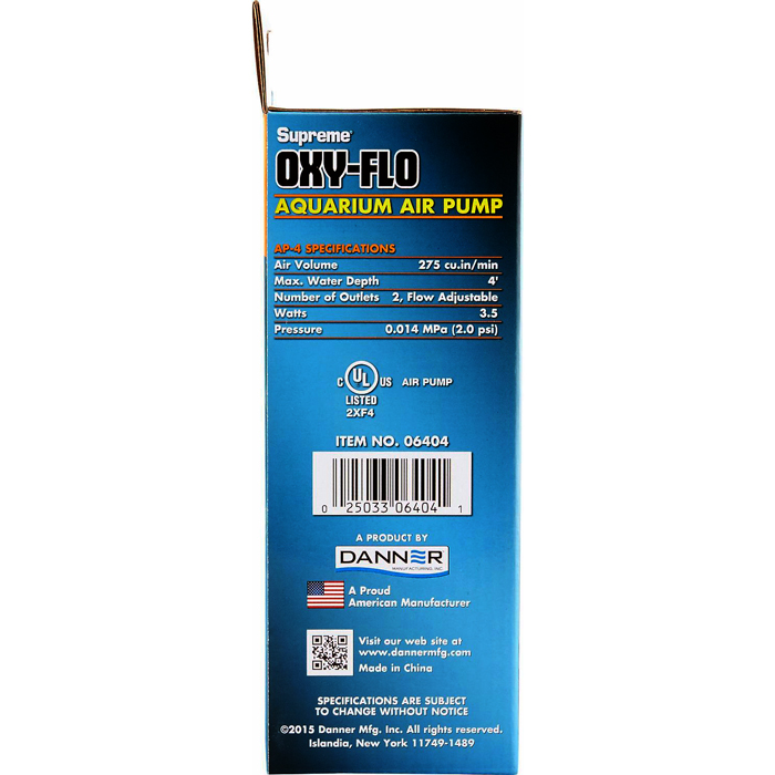 Housed in a sleek outer shell, the AP-4's energy efficient motor draws a mere 3.5 watts to deliver 2.0 psi to dual outlets. Air flow can be finely tuned with the integrated adjustment dial to suit the intended application. Flexible rubber stabilizers keep the AP-4 in place, while effectively absorbing vibrations to ensure quiet operation. With a maximum depth rating of 4 feet, this easy-to-use air pump is capable of powering a variety of aeration accessories accepting standard airline tubing.